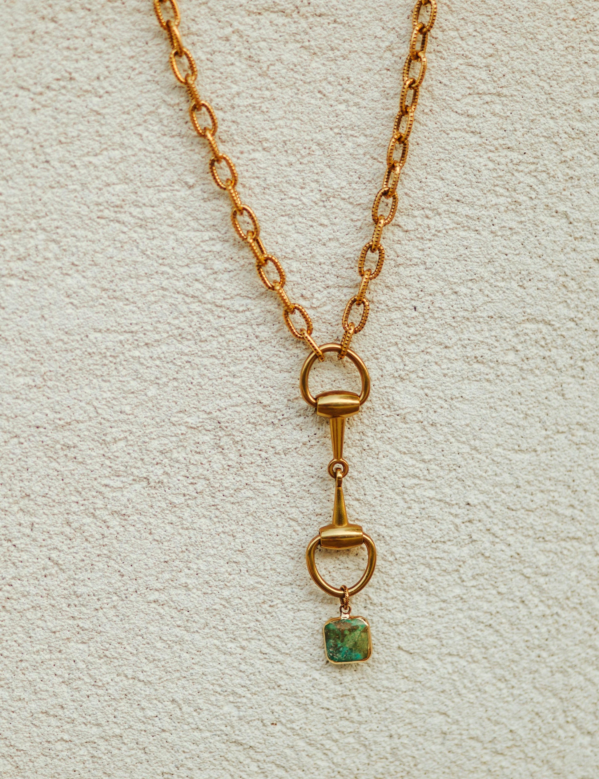 Designed and created by me, a rodeo wife in Texas, USA, the “Money’s in the Mane” necklace is where classic equestrian elegance meets western charm. A 20" textured gold chain holds a gleaming gold snaffle bit pendant, accented with a small gold-plated turquoise charm for a pop of Southwestern color. Most of my materials are sourced from the USA, and my rodeo roots influence every detail. All materials are artisan and handmade, so slight variations add unique character. Normal jewelry care for plated pieces applies — avoid water, lotions, and perfumes to keep it looking its best.